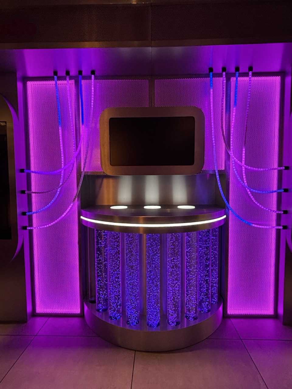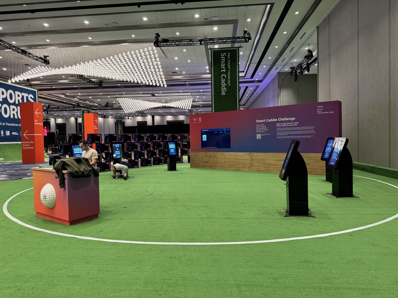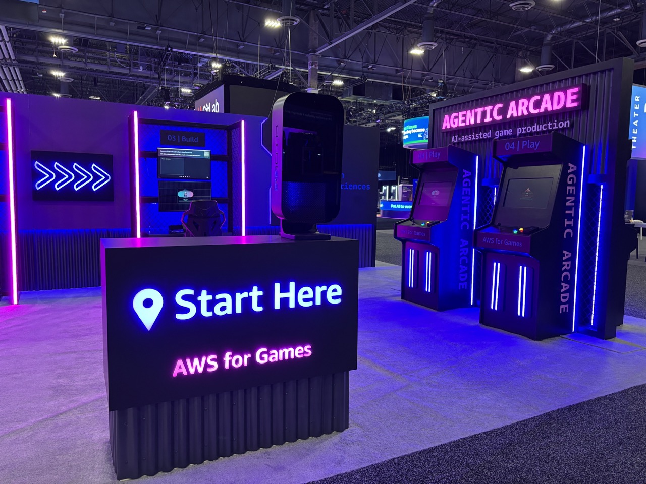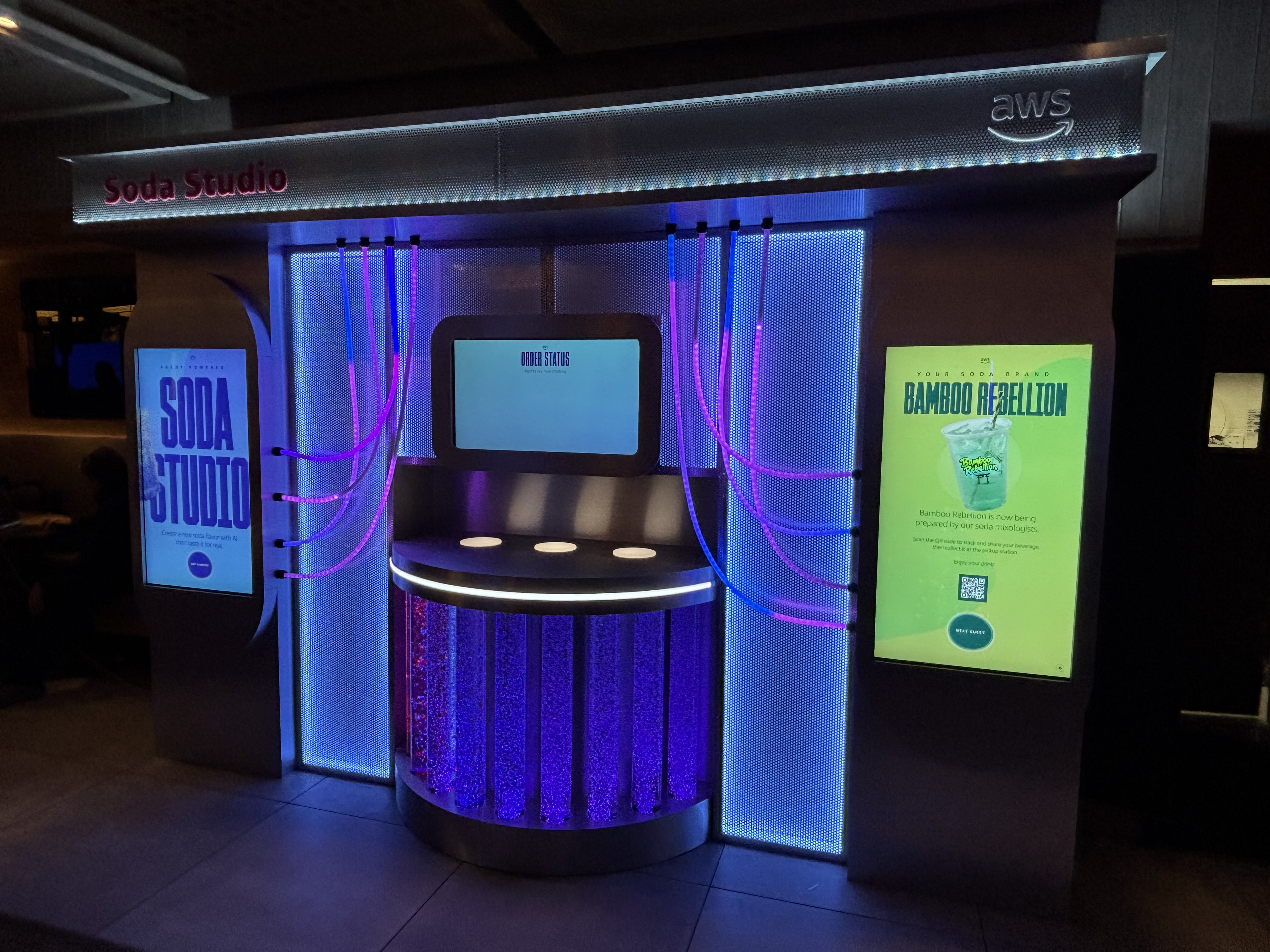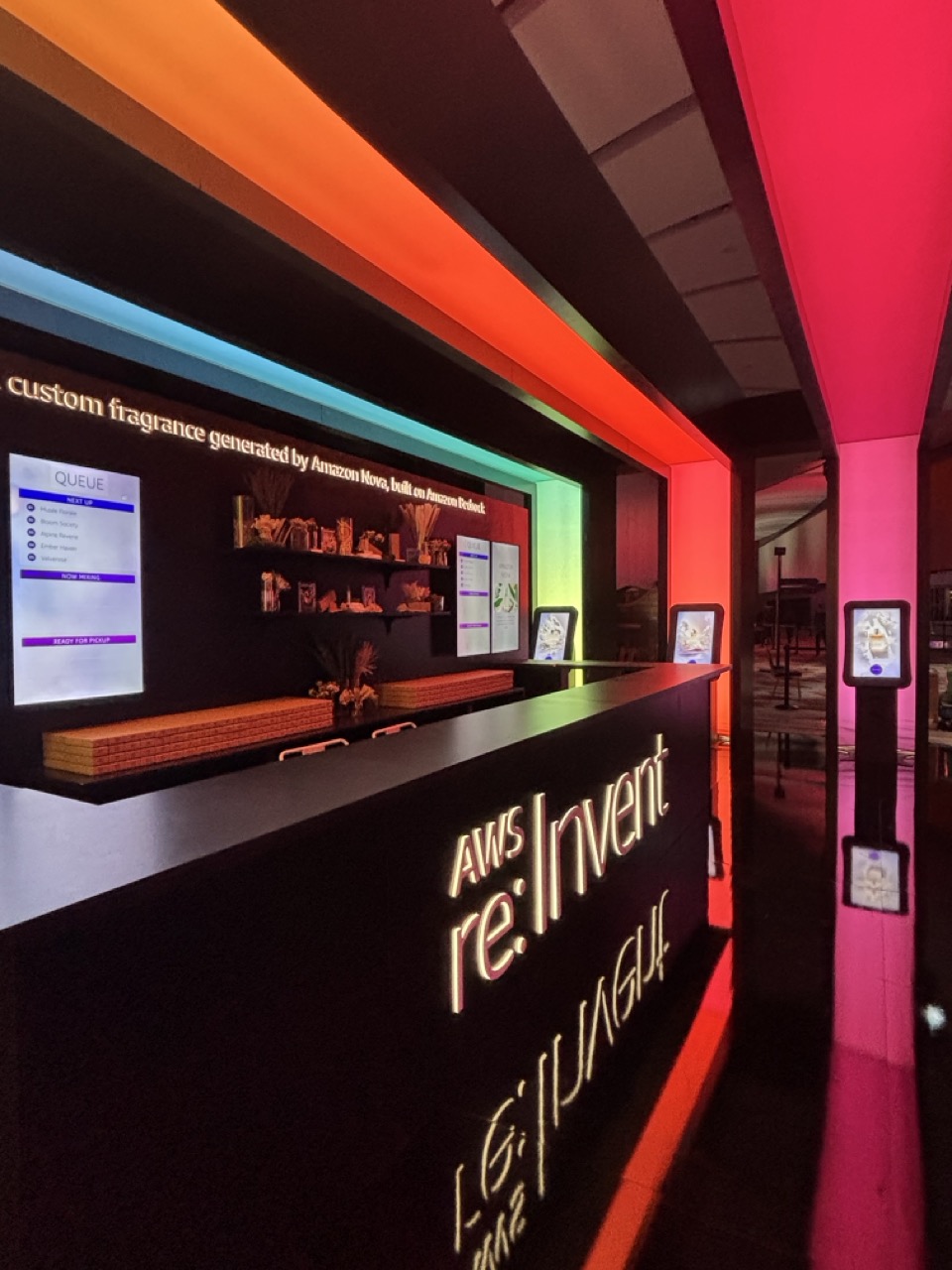 Tractor Vision brought Amazon’s vision to life with a sleek, tech-forward tradeshow environment designed for interactivity and high engagement. The centerpiece featured three squared arches with full cladding, vinyl-wrapped interiors, RGB LED lighting, and illuminated “AWS The Fragrance Lab” signage, creating a bold, immersive entrance. A central storage unit and perfumer desk combined functional wood construction with glossy laminate finishes, integrated shelving, LED under-lighting, and vinyl wraps, providing both display and operational support. The environment included six AI kiosks, fully built turn-key with cooling systems, headphone hooks, and reusable custom crates, designed to showcase client-provided technology seamlessly. Flooring was installed across the space with Marlite hard surfaces and subflooring to safely run power, ensuring a clean, polished foundation for the booth. Additional features included a hard-walled storage booth with vinyl-wrapped flower boxes, a covered cutting station with integrated LED signage and water-resistant desk area, and multiple bouquet display units to complement the interactive AWS brand experience. A free-standing dimensional AWS logo, wrapped in chicken wire for audience interaction, anchored the space as a memorable hero moment.